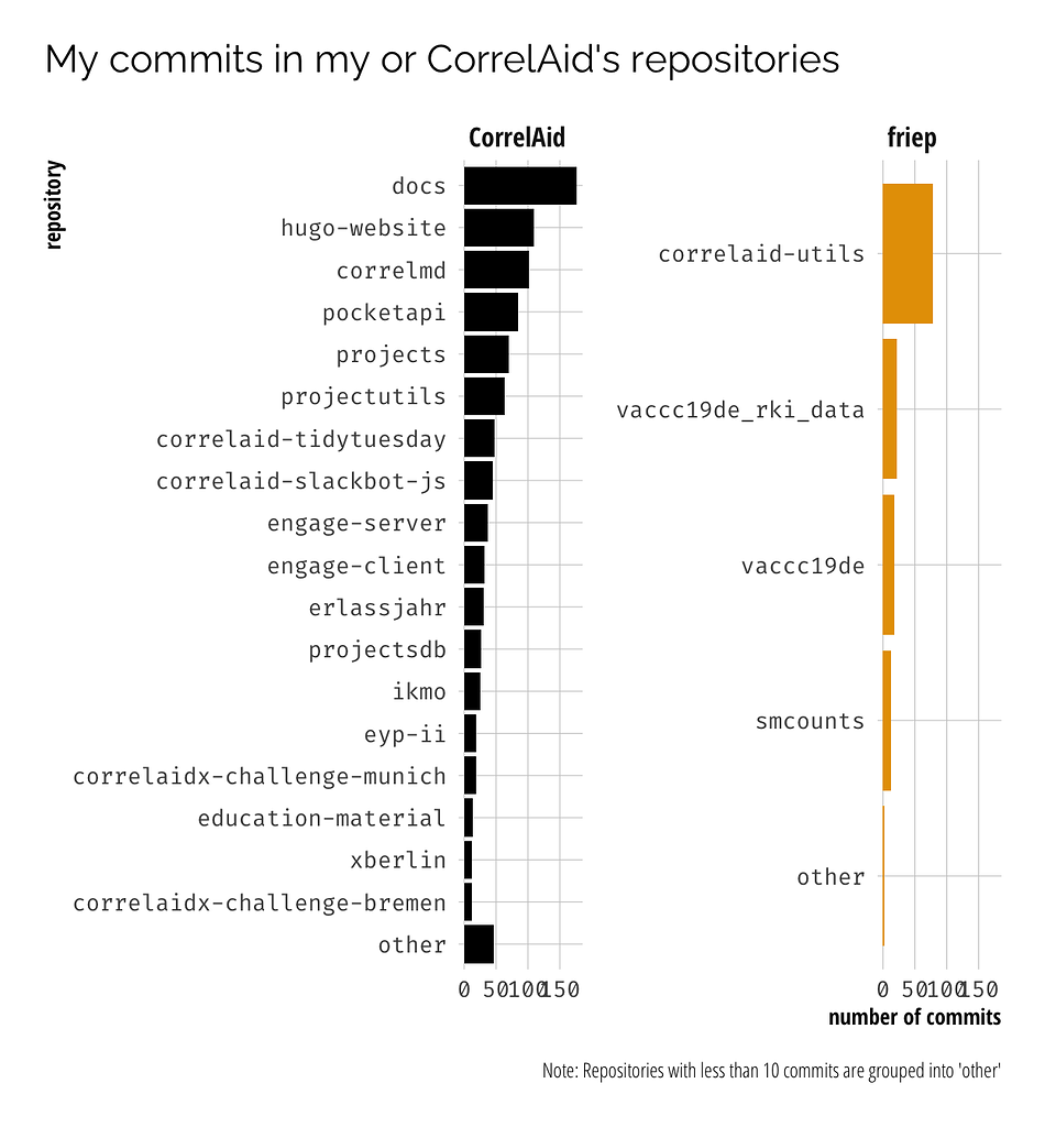 I had a Twitter bot summarize my 2020 contributions on GitHub. I was a bit surprised by the high number of commits that I had made so I decided to have a look into that. I used the GitHub GraphQL API via the ghql package to first pull all the repositories I had contributed to in the past and in a second step get all my commits to those repositories. I then had a look at the “smaller commits” to check whether “~30% of my commits were 1 line diffs” which was my main hypothesis for the high number of commits (spoiler: no, only ~12%). I also had a look at the files that I changed in those small commits (using the REST API via gh). In theory and with some tweaks (mostly adding pagination to the first step), the data collection approach via ghql should be able to give you all your commits to the default branch over all repositories you have committed to. 🤯